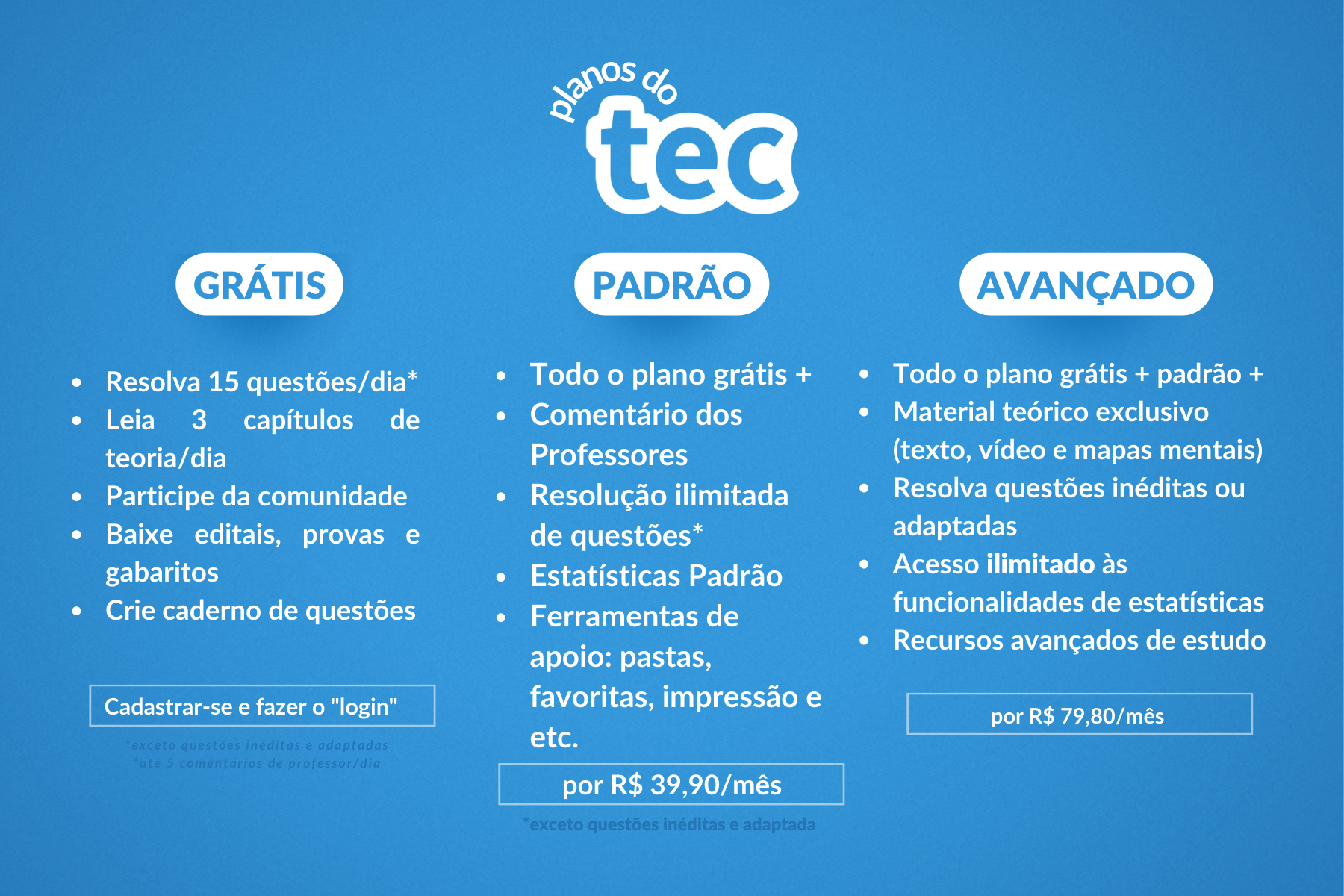 Com o Tec organizo meus cadernos, baixo editais e provas anteriores, os cadernos também, estatísticas e filtros , ferramentas de apoio, as questões são comentadas por professores e dependendo do plano além de poder resolver questões é possível ter acesso a materiais teóricos exclusivos em texto, mapas mentais, vídeos e a recursos avançados de estudo.
